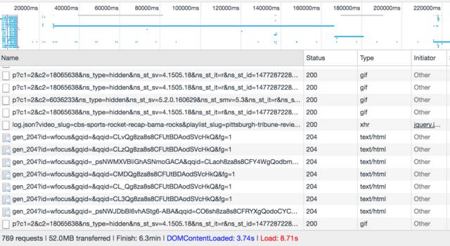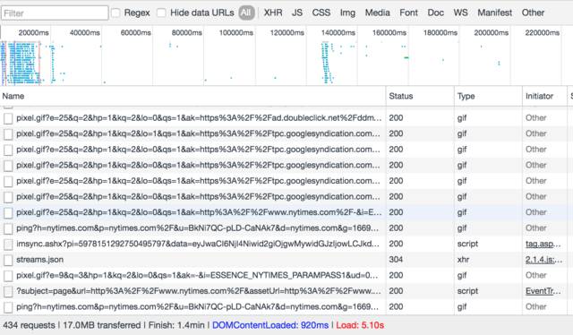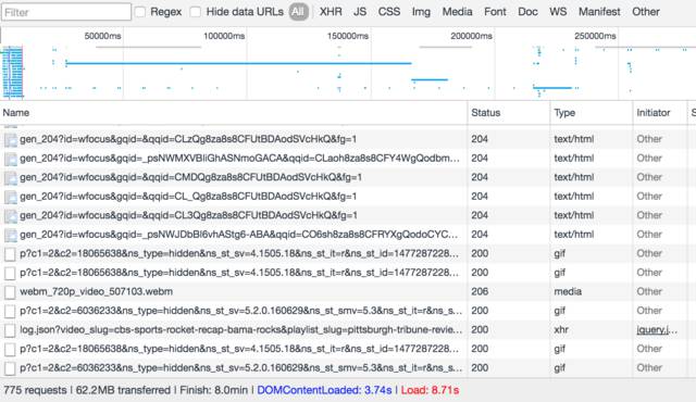 I could have let it go on longer, but I think having loaded 62MB over 8 minutes and no interactions hammers home my point: publishers, and many web developers in general, are designing heavy websites. While this is a notoriously bad site, even the a large national paper loads 17MB after only a minute.