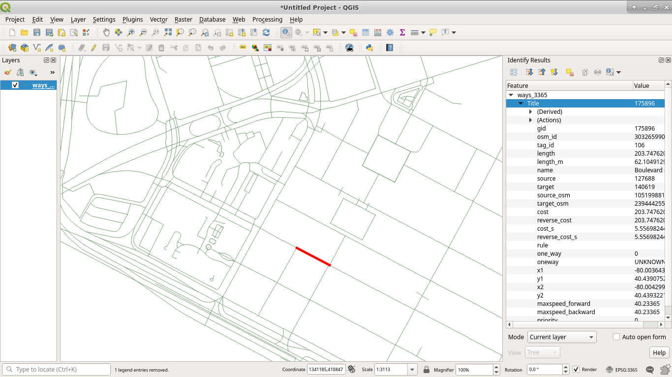 we examine a random road from the ways table in QGIS, we'll notice that its