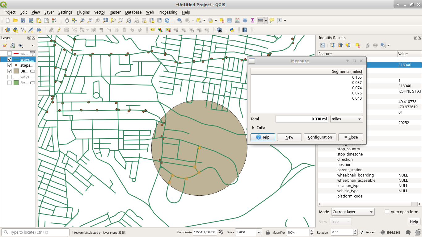 Now, we can run our walkshed calculation again. However, we can clean it up a little as well, now that we have much smaller segments to work with. Again, just for S18340 because we want to iterate quickly.