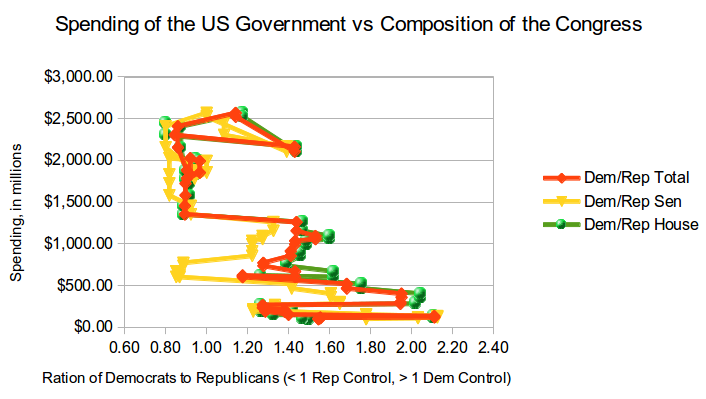 The quick version: On average Republican-controlled Congresses spend $1,912.81 (million) and Democrat-controlled Congresses spend $690.43 (million). The more detailed picture is, as it usually is, more complex where more recently both parties are spending at record levels. The following picture shows spending on the Y-axis in millions and the X-axis is the ratio of Democrats to Republicans (< 1 is Republican Controlled, > 1 is Democrat controlled).