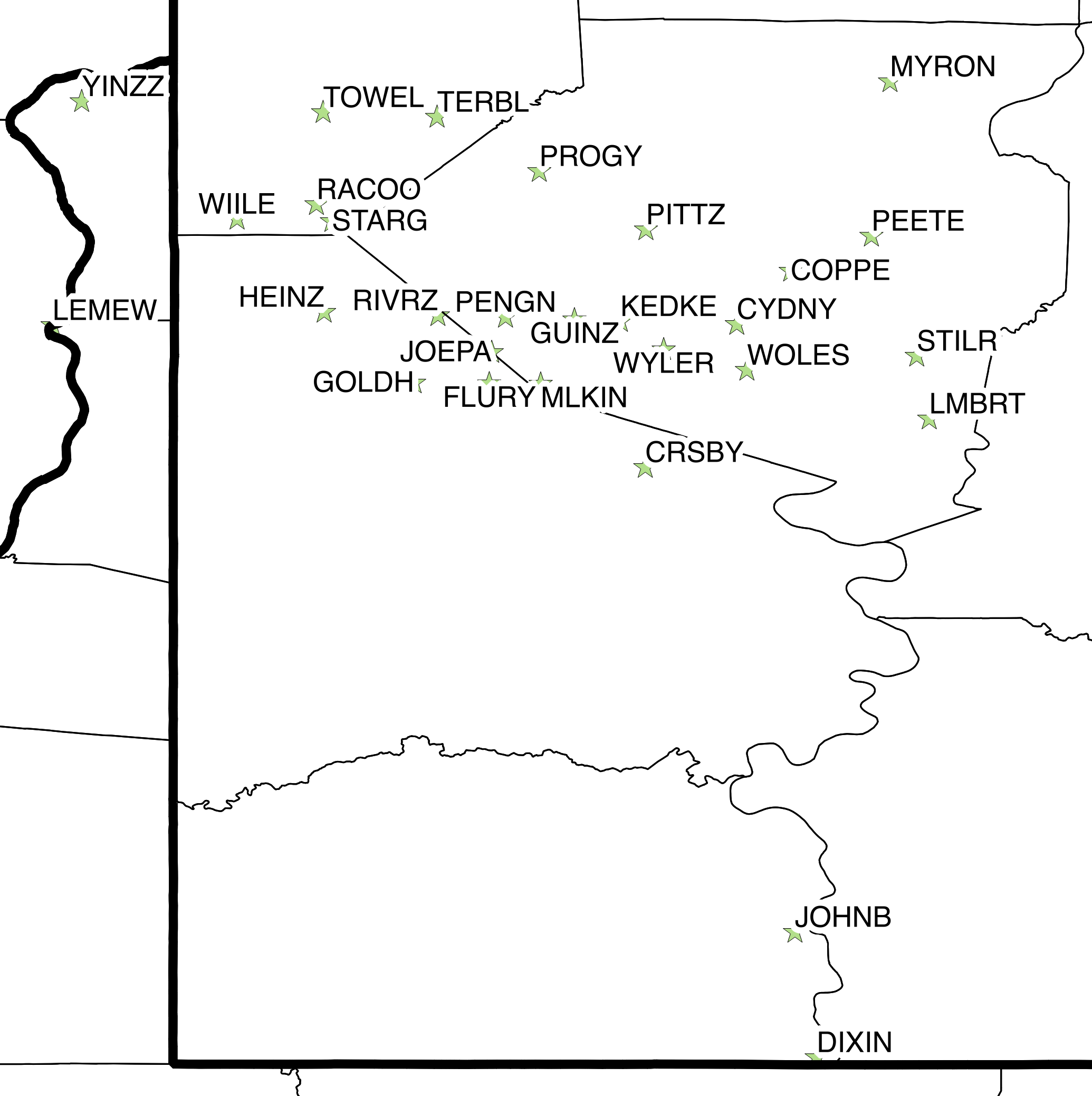 At lunch yesterday some coworkers and I got onto the topic flight waypoints and I was reminded of funny air waypoints. While waiting for some code to run, I decided to look up some for Pittsburgh. I found the STARs and IAPs and saw obvious gems like TERBL TOWEL, MYRON COPPE, PENGN GUINZ, RIVERZ, and HEINZ. I knew I had to look deeper! I had some trouble finding a list of waypoints, but stumbled upon fplan and its 2015 database. With a little `sed` magic, I was able to extract a file qgis could read. I quickly found a handful more!
